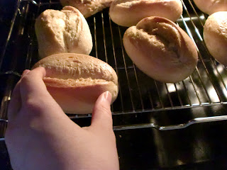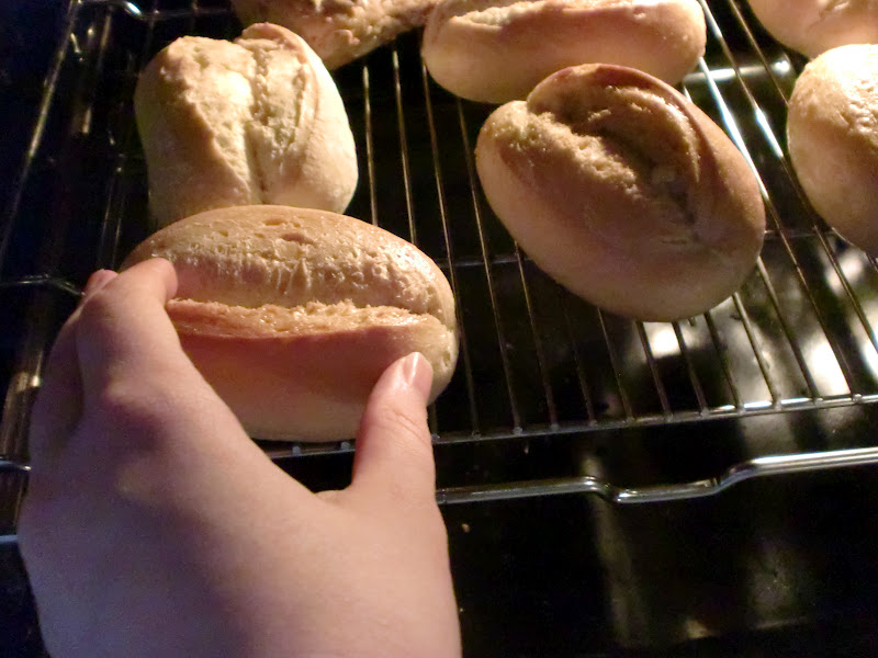 Frühstückstisch gedeckt und Brötchen aufgebacken.