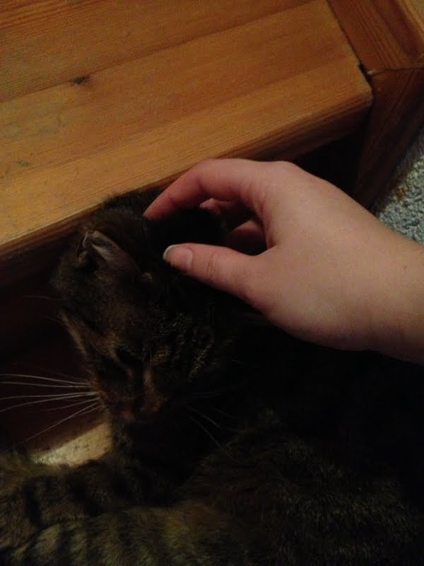 Die Katze gestreichelt. Er schläft immer auf der Bodentreppen und jedesmal, wenn jemand hoch geht bekommt er etwas von ab. Sehr schlau unser Kater.