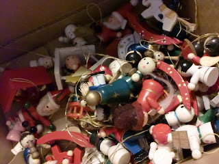 Die alten Weihnachtsbaumanhänger unserer Eltern durch zwei teilen.