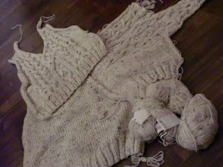 Zwei Mal das Vorderteil mit dem Zopfmuster. Ja die gute Frau hat ja gesagt, dass ich einfach alles mit zwei Knäulen stricken soll. Leider haute die Maschenangabe, trotz Umrechnen mit der neuen Maschenprobe so gar nicht mehr hin. Ich hatte das erste Teil fertig und probierte es probehalber an. Gut es war etwas weiter, naja ich dachte ich versuch es dann mal mit dem Rückenteil. Das habe ich nur bis zur Hälfte gestrickt, weil mir aufgefallen ist, dass ich bei diesem Rückenteil gar kein Vorderteil mehr benötige. Denn es ist einfach viel zu groß geworden. Ich bin ja geduldig und habe dann alles neu berechnet und noch mal ein kleineres Vorderteil angefangen. Das hat super geklappt von der Breite war es super. Da bei dem Vorderteil ganz lange Schulterteile gestrickt werden und diese dann tief ins Rückenteil genäht werden, konnte ich die Länge des Vorderteils noch nicht einschätzen.