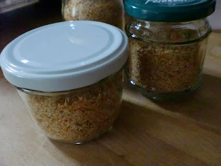 Alles habe ich auf drei Backblech gegeben und im Ofen, mit angelehnter Tür getrocknet. Es dauerter sehr lange bis alles trocken war. Das trockene Gemüse habe ich wieder in Küchenmaschine gegeben und alles zusammen mit Salz ganz klein gemahlen. Für 150g getrocknetes Gemüse habe ich 15g Salz genommen.