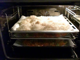 Die Auflaufform bein 180°C in den Ofen geben, bis alles schön knusprig braun ist.