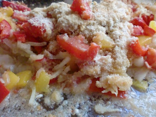 In eine Auflaufform kommt etwas Öl und dann der Fisch drauf. Der Fisch wird mit Salz, Pfeffer und Zitronensaft gewürzt. Nun werden die Tomaten, die Paprika, die Zwiebel und der Knoblauch klein geschnitten und über den Fisch verteilt. Die Kräuter darüber streuen und den Käse in Würfeln darauf geben. Alles mit einer dünnen Schicht Paniermehl bestreuen.