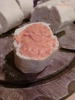 Die weiche, etwa zimmerwarme, Butter verrührt ihr mit einer klein gewürfelten Zwiebel und der halben Tube Tomatenmarken und schmeckt die Butter mit etwas Salz, Pfeffer und Paprikagewürz ab. Ihr könnt versuchen die Butter mit dem Pürierstab oder mit der Küchenmaschine verrühren. Ich nehme immer eine Gabel, weil es dann schneller geht. Es sieht aber nicht so schön aus, wie mit dem Pürierstab. Schmecken tut sie, egal wie ihr sie macht!