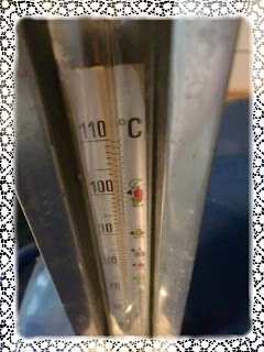 Dank meiner Oma habe ich extra einen Topf zum einwecken, mit Thermometer. Also Kirschen bei 85°C.