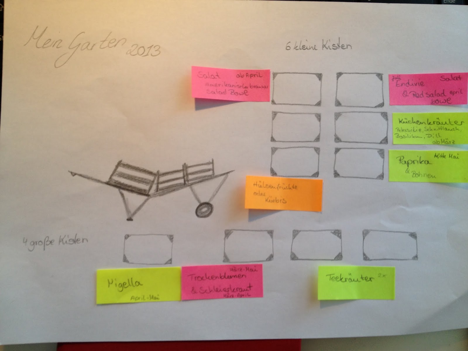 Hier habe ich schon mal meinen vorläufigen Pflanzplan. Bewusst mit Post-Its versehen, denn ich bin mir nicht so sicher, dass auch alles so wächst wie es soll.